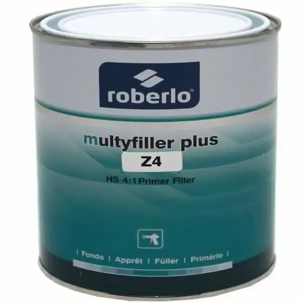 Грунд филер ROBERLO High Solid 4:1 MULTYFILLER PLUS Z е висококачествен запълващ грунд с високо съдържание на сухо вещество, разработен за автомобилни приложения и ремонтни дейности. Той предлага отлична адхезия и покривност върху различни видове повърхности, включително метал, пластмаса и стари лакови покрития. Продуктът е създаден, за да осигури гладка и устойчива основа за последващото боядисване, като осигурява пълно покриване на дефекти и неравности.